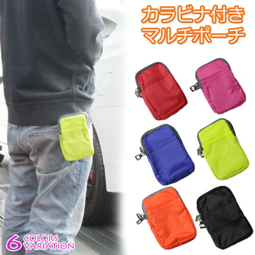 カラビナ付き マルチポーチ ダブルファスナー 全6色 【カラー】 ピンク/オレンジ/レッド/ブルー/ライム/ブラック ■仕様 前面ポケット×1 メインポケット×2 カラビナ付きなので、ジーンズやカバンなどにかけられます。