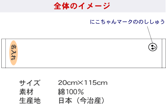 ・生産地:日本(こちらは今治産ですが、今治タオルの申請はしていません) ・素材:綿100% ・サイズ:20cm×115cm ・カラー:ネイビー にこちゃん ・配送:定形外 宅配便(メール便不可) ※有料ラッピング入れの場合は、定形外郵便もしくは宅配便でのお届けでメール便でのお届けは不可となります。