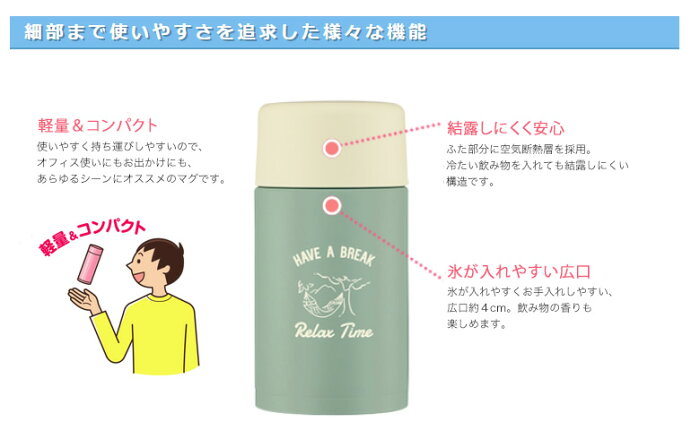ふた部分に空気断熱層を採用しており、冷たい飲み物を入れても結露しにくい。